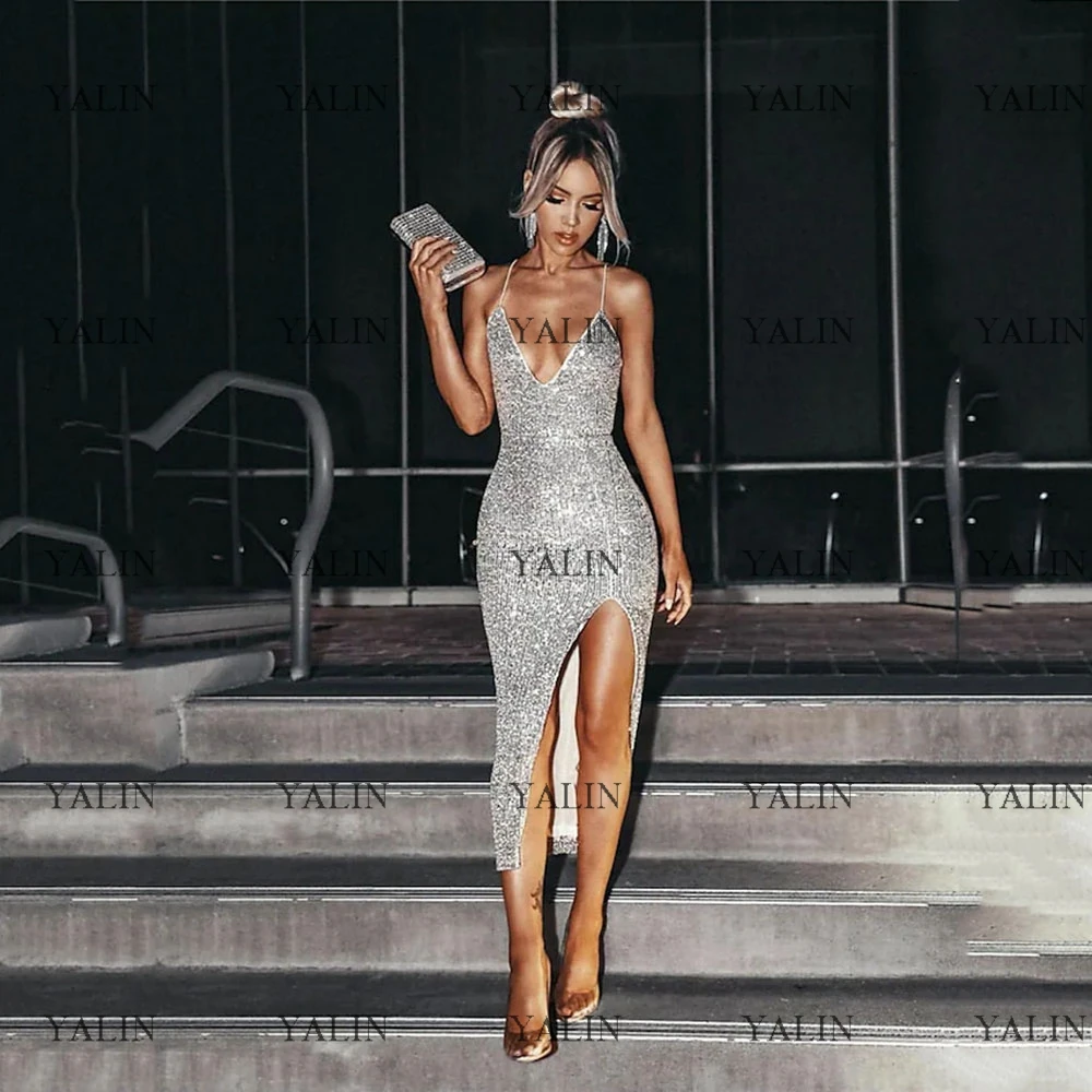 "YALIN Sparkly Column Cocktail Party Dresses Midi Length Front Slit Sequined Prom Dresses Deep V-Neck Silver Evening Gowns" * Buy Now Just For 71$