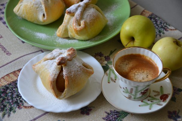 Яблоки в "платочках" - такое милое название у этой вкусной и быстрой домашней выпечки из слоеного теста . Готовится быстро, получается очень вкусно, рецепт простейший .