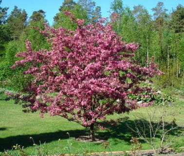Описание сорта . Яблоня Макамик относится к декоративным сортам . В период цветения дерево украшают крупные цветы пурпурного оттенка, а осенью мелкие, ярко-красные яблочки .