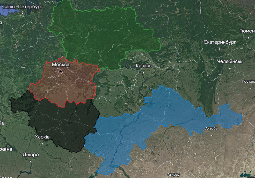 - Приволжський ФО: частини Нижньогородської та Кіровської обл - до Московії; Саратовська, Самарська, Оренбургська обл - до Московії,