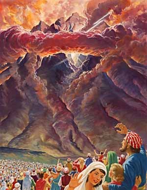 Приготовление через омовение указывало на чрезвычайность предстоящего события. На третий день с наступлением утра раздался гром и блистали молнии. Над горою показалось густое облако. Затем послышался сильный трубный звук. Весь народ был в трепете. Гора Синай дымилась и сильно колебалась. Господь сошел на нее в огне. Звук трубный становился все сильнее и сильнее. Моисей говорил, и Бог отвечал ему. Господь призвал Моисея на вершину горы, и он взошел.