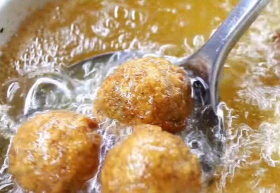 7. В разогретое масло выкладываем яйца по-шотландски и жарим во фритюре 1,5-2 минуты на среднем огне.