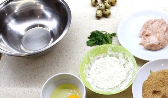 1. Подготавливаем необходимые ингредиенты для яиц по-шотландски. Заранее отвариваем вкрутую перепелиные яйца, остужаем и очищаем.