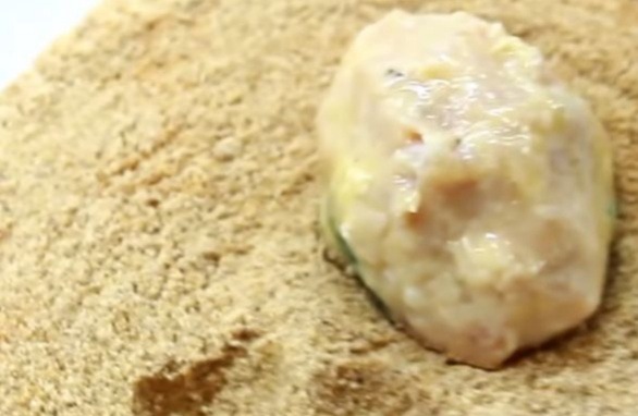 5. Обваливаем шарики в муке, окунаем во взбитое куриное яйцо и панируем в сухарях.