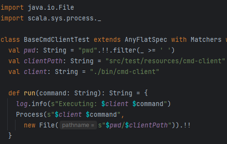 Все, що потрібно зробити, це додати вашу утиліту в src/test/resources, додати пакет scaдa.sys.process та розрулити місце, з якого ви запускаєте ці тести (pwd).