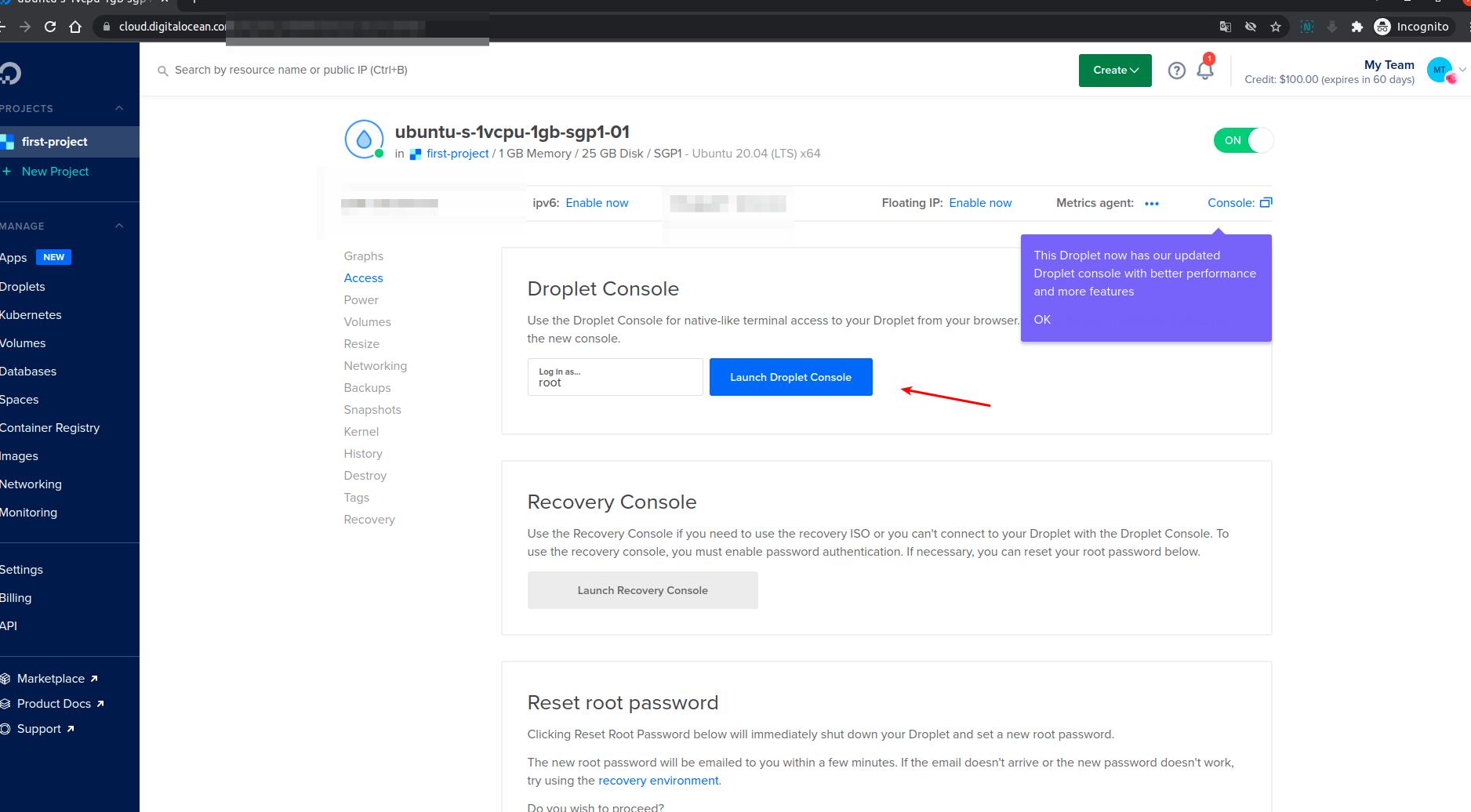 6. Клацаємо на 3 точки, як показано на малюнку вище і вибираємо пункт "Access console". Нас перенаправляє на сторінку і жмемо на кнопку Lauch Droplet Console