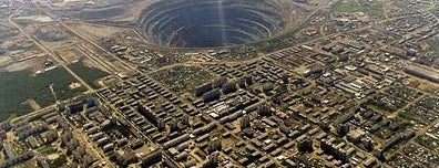 Город Мирный находится в юго-западной части Республики Саха и является центром Мирнинского района . Его жизнь связана с наличием открытой в 1955 году кимберлитовой трубки «Мир» и активной добычей алмазов . Первоначально она велась открытым способом . В результате образовался один из самых крупных карьеров мира .
