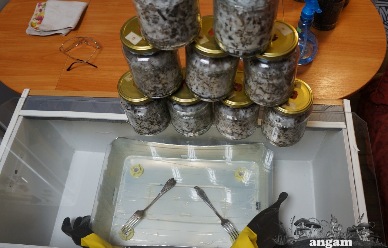 Парник готовлю за сутки-наливаю 6 литров чистой воды и облучаю УФ лампой в течении часа.Затем включаю обогреватель,компрессор и вентиляцию.Через сутки парник набирает обороты необходимые для грова-влажность 100% и температуру 28 гр.