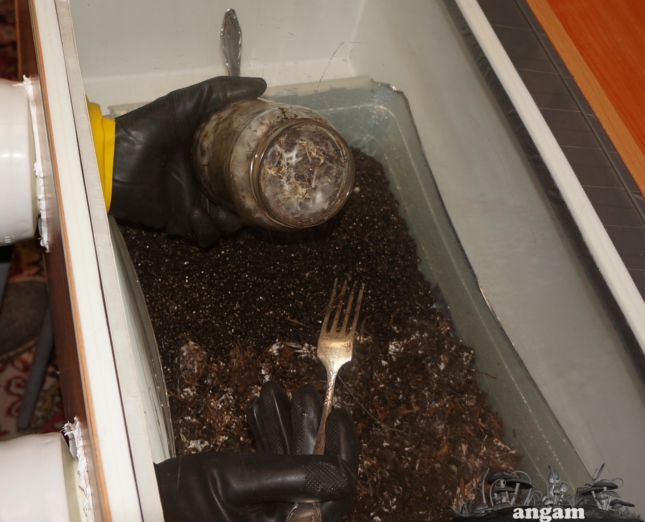 Мою с доместосом парник и контейнер.В глоубоксе готовлю кейк и помещаю на обрастание в инкубатор.