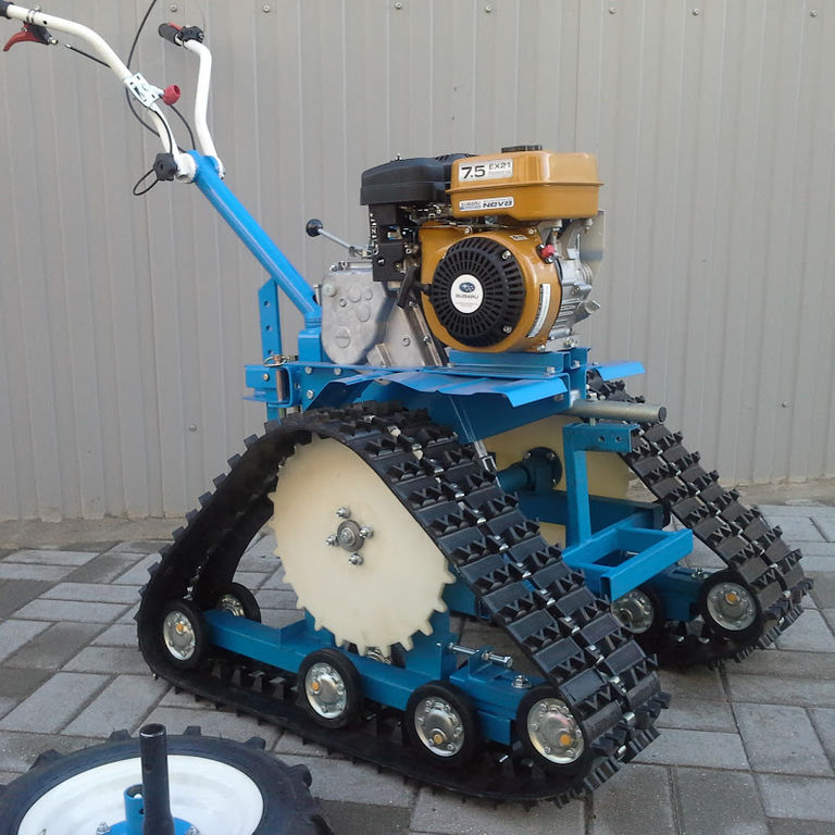 Сначала мотоблок был электрический — за ним тянулся длинный электрический провод, от которого двигатель и работал . Но в скором времени на него были установлены бензиновый двигатель и фреза .