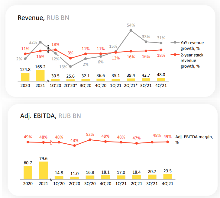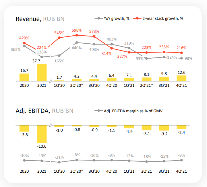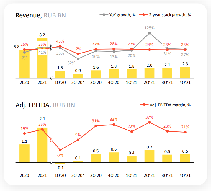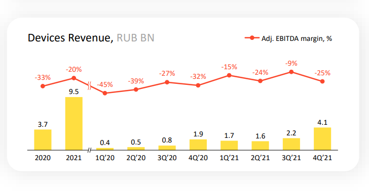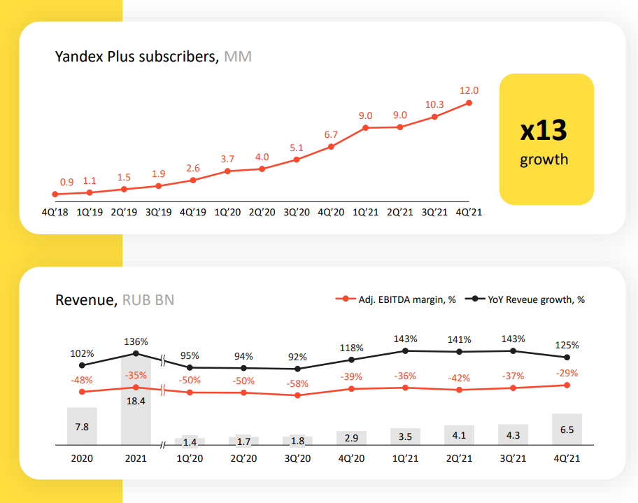 Количество подписчиков выросло до 12 млн человек, выручка сегмента составила 18,4 млрд ₽ в 2021 году. Правда, сервис также убыточен - маржинальность составляет -29%.