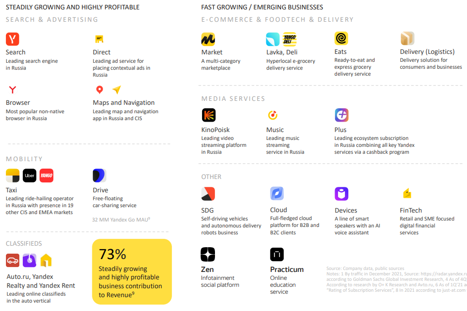 - Другие бизнесы и эксперименты: Автономные автомобили и роверы, Облако, Девайсы, Дзен, Практикум и Финтех (впервые показан в презентации).