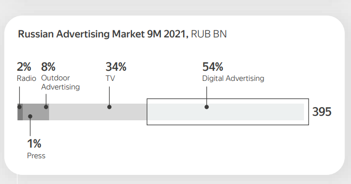 Яндекс обращает наше внимание на то, что цифровая реклама (54%) уверенно отъедает бюджеты у "традиционных" рекламных площадок, таких как: радио (2%), бумажная пресса (1%), наружная реклама (8%), телевидение (34%). Этот процесс начался не вчера, и он продолжается - так что топливо для роста ещё есть.