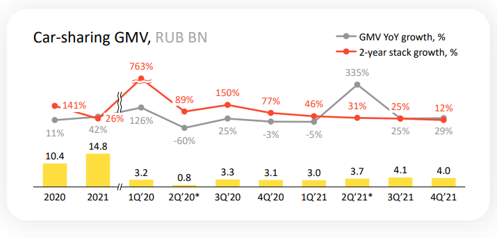 Оборот по каршерингу в 2021 году составляет 14,8 млрд ₽. Каршеринг работает всего в 4 городах (Москва, СПб, Казань, Сочи). Наверное, это очень дорогое удовольствие, и в другие города заходить нерентабельно. Каршеринг по итогам 2021 года оказался прибыльным, и заработал 1,2 млрд ₽.