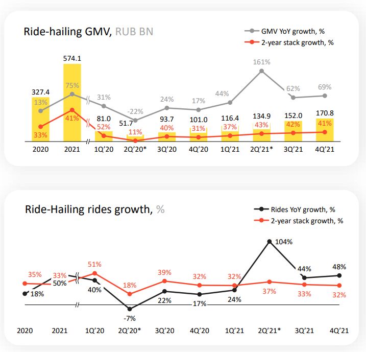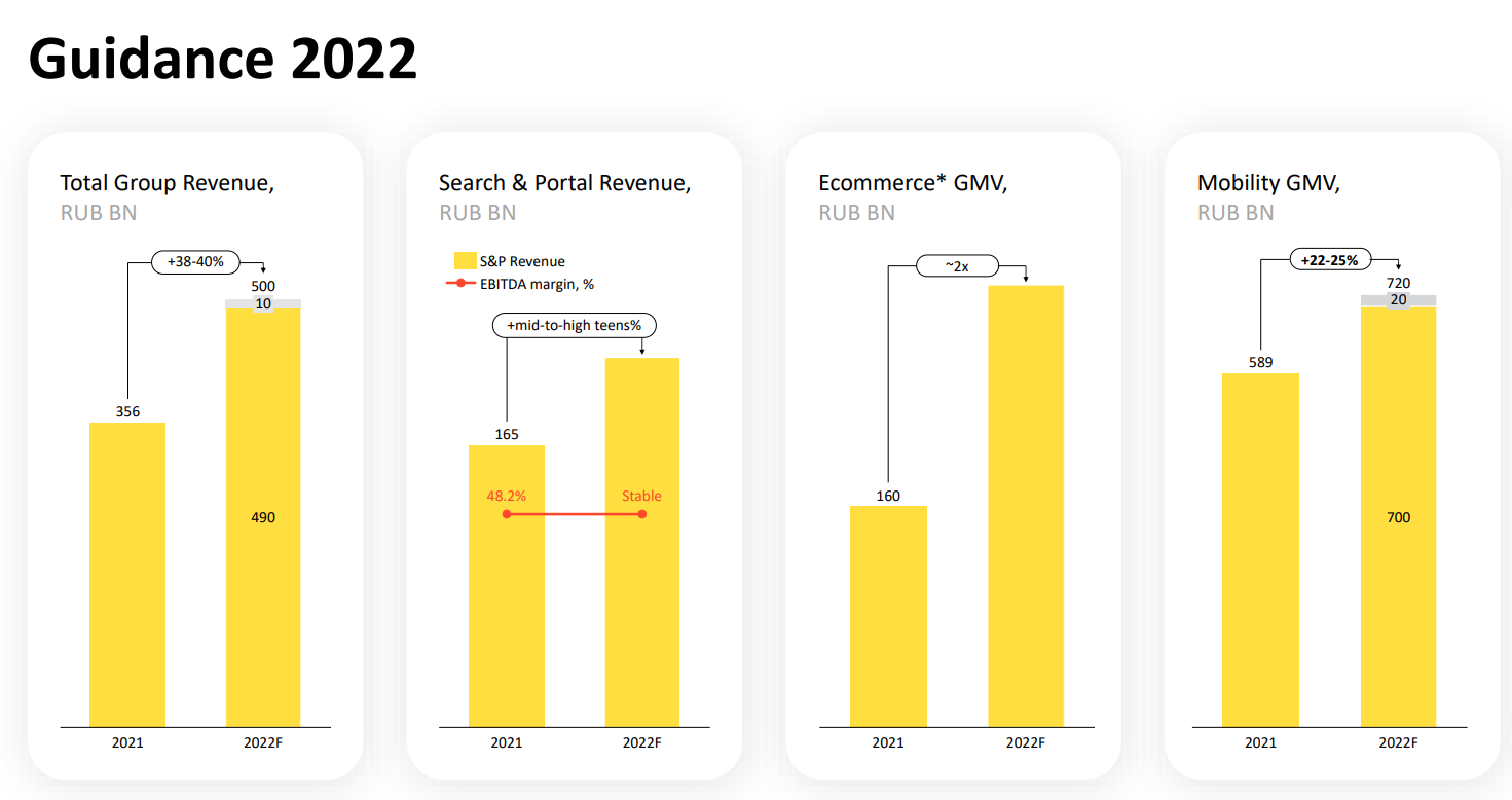 Планы на следующий год - амбициозные. Я полагаю, рынок воспринял позитивно не столько показатели за 2021, сколько прогнозы на 2022. Возможно, в 2022 общая выручка Яндекса превысит 500 млрд ₽, а Такси и сервисы Электронной коммерции на двоих накрутят оборот в 1 трлн ₽. Могу лишь пожелать удачи, ведь я имею прямой интерес.