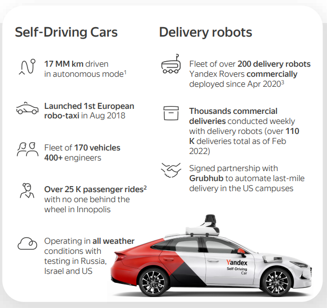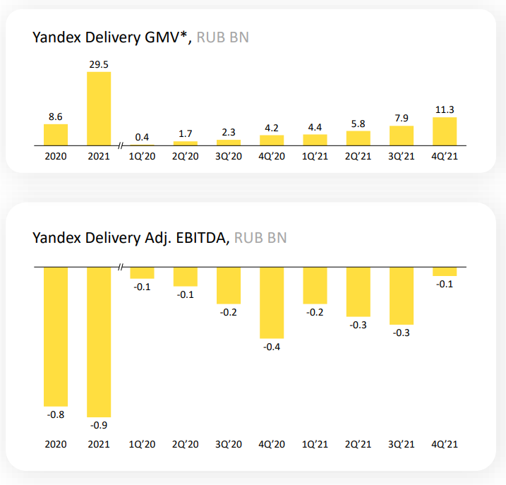 Логистика всё ещё убыточна, но по итогам 4 кв. 2021 на 11,3 млрд ₽ оборота пришлось всего 54 млн ₽ убытка - так что есть большая надежда на то, что и этот бизнес Яндекс выведет в прибыль, как он умеет делать и доказал это на примере Такси и Каршеринга. Будем наблюдать.
