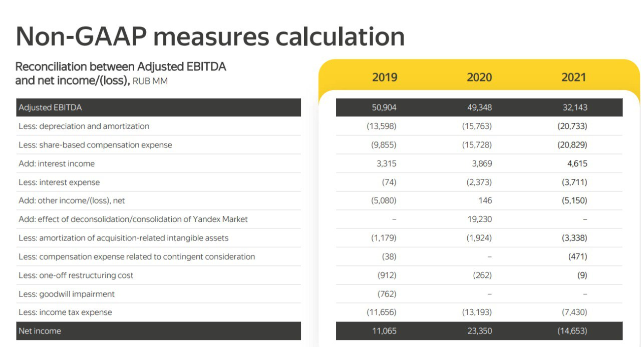 По метрикам международных стандартов финансовой отчётности (МСФО или GAAP), Яндекс показал значительный убыток по итогам 2021 года - 14,6 млрд ₽. Эта метрика используется во всех скринерах при расчете показателя P/E, к примеру. Так что не удивляйтесь, если увидите, что Яндекс выпадает из выборки хороших прибыльных компаний при настройке соответствующих фильтров.