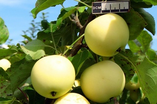 Основной окрас- светло-зеленый или светло-желтый . Яблоко покрыто также небольшими красными или розовыми пятнышками . Дочь Мельбы ценна своей белой ароматной сочной мякотью . Фото