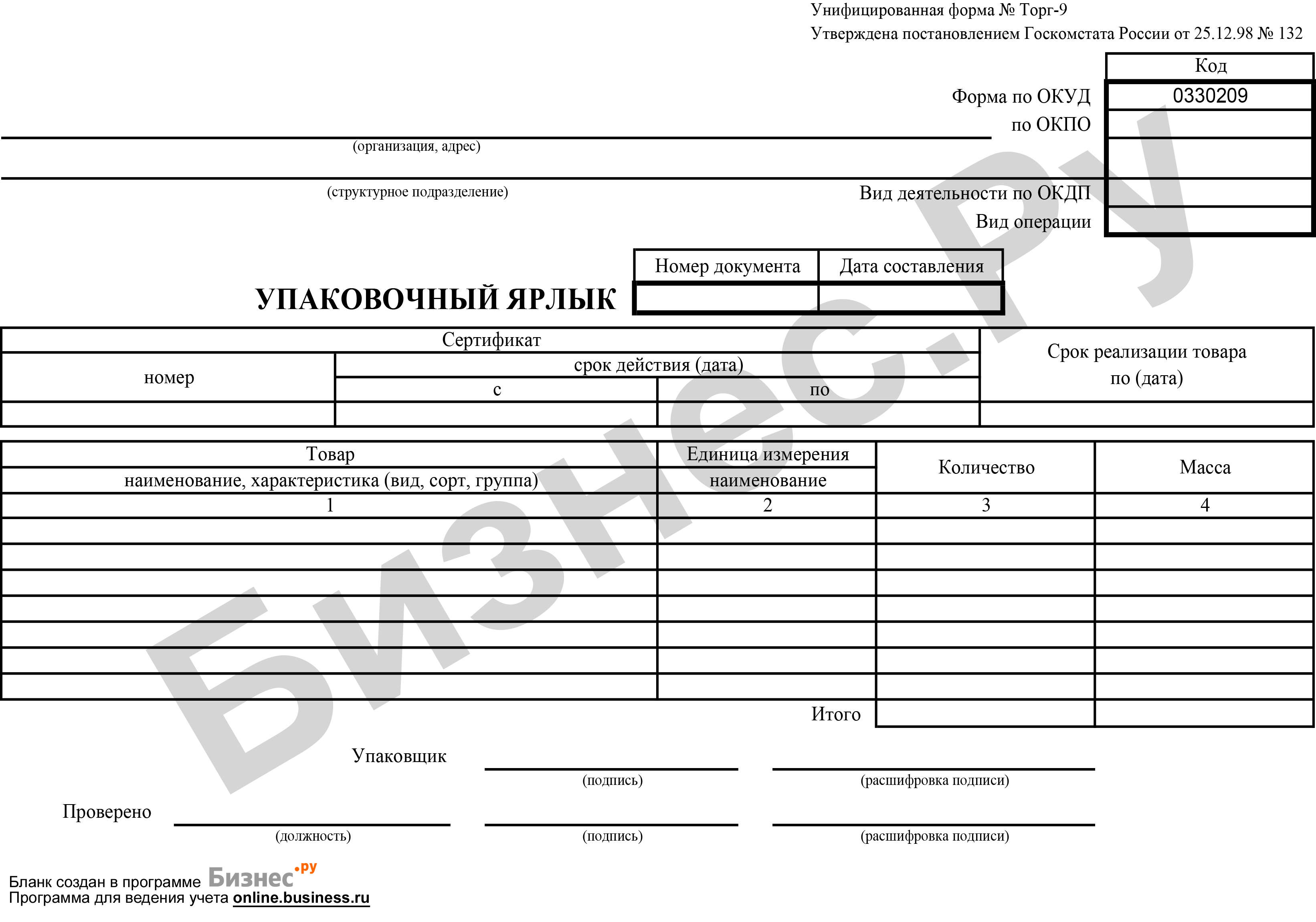 Ярлык на складе образец
