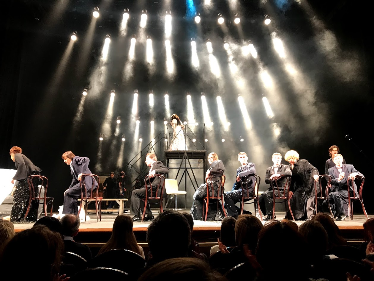 Собравшая полный урожай номинаций на золотые маски в 2017 году постановка идёт на большой сцене и наконец-то я смогла оценить роскошь и величие собственно здания волковского театра. Городская гордость (местные кондитеры делают пряники с его изображением), отремонтированный так, что большинству московских театров и не может присниться, волковский театр в субботний вечер набился под завязку.