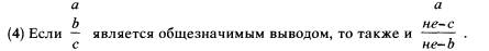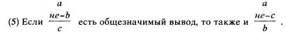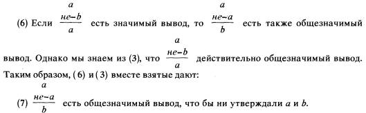 Правило (5) может быть получено, например, из правила (4) вместе с законом двойного отрицания, согласно которому из не-не-b можно вывести b. Однако если (5) значимо для любого высказывания а, b, с (и значимо только при этом условии), тогда оно должно быть значимо и в том случае, если с окажется тождественно а, иными словами, должно быть значимо следующее: