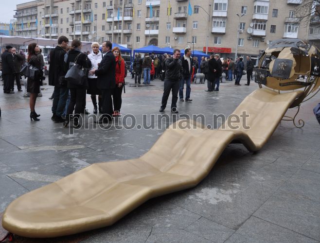 Фото Памятник "Язык до Киева доведет", созданный участниками Третьего Всеукраинского Житомирского Фестиваля кузнецов «Кузнечная Весна» в Житомире, в пятницу, 6 апреля 2012 г . В центре композиции металлический глобус . . .