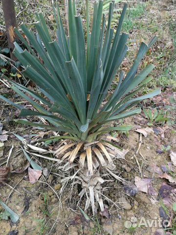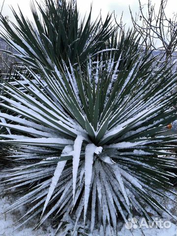 Сизая юкка достигает в высоту 2 метров . Она происходит родом с западного побережья штатов . Длина листьев составляет 60 см, а их кожистая поверхность окрашена в зеленый цвет с голубым оттенком .