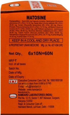 Инструкция по применению: принимать по 2 капсулы два или три раза в день с молоком или водой. Матосин не оказывает токсического действия. Не рекомендуется превышать дозировку препарата. Хранить в сухом и прохладном месте, недоступном для детей. Плотно закрывайте крышку лекарства после каждого использования. Храните лекарство в оригинальной упаковке и контейнере.