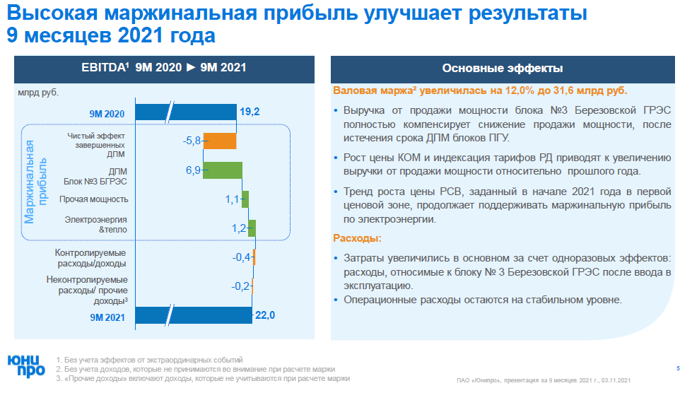 Интересен тот факт, что выручка от продажи мощности блока № 3 Березовской ГРЭС (которая начала поступать с мая 2021 года) полностью компенсировала снижение продажи мощностей после истечения срока ДПМ других четырех блоков ПГУ.