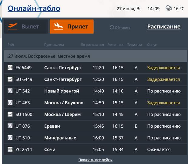 Южный ветер табло вылета