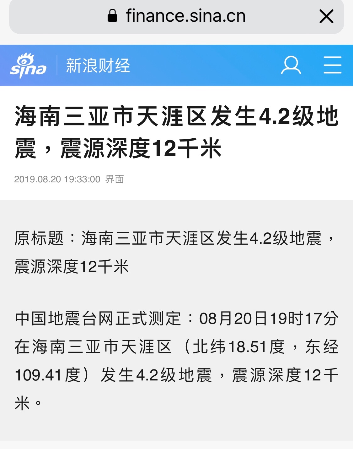 這個就確實,其實呢,比較恐怖。因為我正在說這個三界感應,關于地震的問題。這就是三亞的叫,天涯區。這個節目的標題就是什么,就是最后為了劇本的結果,叫做“云中世界樂無涯”。安樂無涯,長生安樂。云中世界呢,云中就是天。樂無涯呢,就是涯,就是天涯。就發生了地震。同一天呢,上午到晚上的19點,兩次,在同一個地方兩次地震。4.2級,其實也不算小了。震感應該很明確了