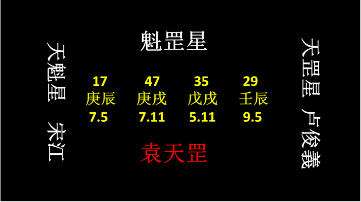 然后這四個數,叫魁罡星。就是梁山108將,第一名,宋江,他叫天魁星。第二名,盧俊義,天罡星。所以叫,魁罡星。魁罡星,就是比較兇的,將星,執掌生殺大權,說白了講,可以殺人的。歌訣講:命帶魁罡原數奇,重重疊疊掌大權。其實就是這四個數。就是四個干支,天地干支。庚辰,庚戌,戊戌,壬辰。分別就是,17.47.35.29。編《推背圖》,看天象的人叫袁天罡。為什么叫袁天罡呢?就是這個含義。因為它都形成這個數。基督之數。這些就叫秘密。什么叫秘密?我再說一遍,這就叫秘密。天數,天象之數。