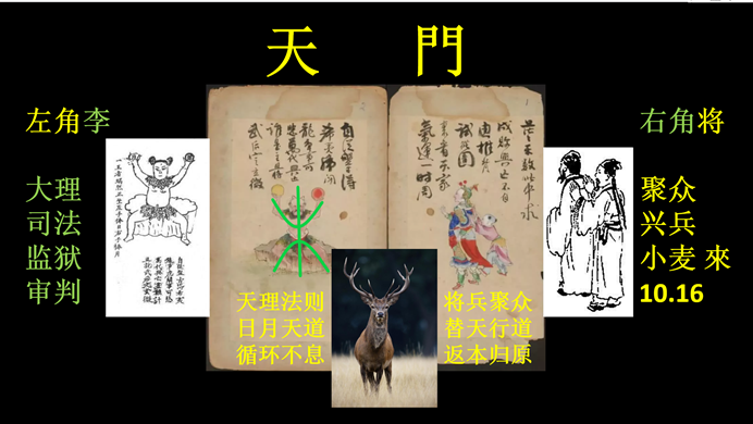 最后就形成天門。在這個版本的《推背圖》里,我把它放在這,這就明確的講了。在這個金圣嘆這個版本,你還看不出它是個將字,是兩個穿長衫的人,你可以說是袁的本意。但是在元朝版《推背圖》,就說的非常的明白了,一個子兒童,推前邊這個將。這是穿盔甲的將,這是本意了。左邊就是木子,天門,代表天門,歷算之數,陰歷,陽歷。天文歷算之數。這兩個在這是合一的,其實告訴大家,就是天門嘛,左角李,右角將。李是大理司法官,管懲罰的,管監獄,審判,執行。右邊,這個將,就是聚眾,興兵造反。也是角宿一,就是小麥,小麥的日子是,10.16。因為太陽,10.16日,經過角宿一。就是右角將。這是鹿的兩個人,兩個天門。左角李,右角將,就指的這個含義。