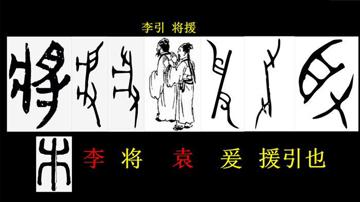 含義就是像金圣嘆批的這個,一人在前,一人在后。在前邊這個李淳風,李淳風算數的。后邊這個袁天罡。也就是說,李引,將援。李引著前邊走,他倆推背而行,前邊這個叫引導,引著后邊這個,后邊這個叫推助。叫助推,叫援手。他倆一個意思,推動歷史往前走。這兩個字合起來就是將。這是袁的甲骨文,金文,也是手,月,身體。這個將字,最終形成這個將字。就是圖最左邊這個將字。已經完全一致了。李和袁,木和將字的聯系,也就是,歷史怎么往前走,數怎么運算,大家有時間可以細琢磨一下。