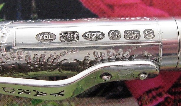 Yard-O-Led maker's mark and S date code (2017) . Sterling silver hallmark (925) and Birmingham Assay Office mark (anchor) . The end of the pen is shaped much like the section so the pen can post well . The pen will fill with the Kaweco mini piston converter, not the squeeze type .