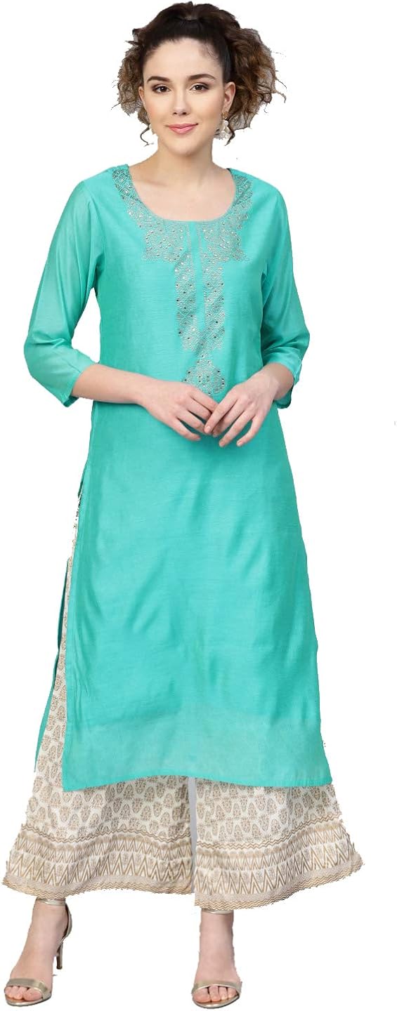Pink yoke design kurta with palazzos . Pink A-line calf length kurta with thread work, has a notched round neck, three-quarter sleeves, flared hem, side slits . Pink solid palazzos, has elasticated waistband, inner drawstring closure . This chic pink kurta set from Bhama Couture is the perfect blend of elegance and comfort .