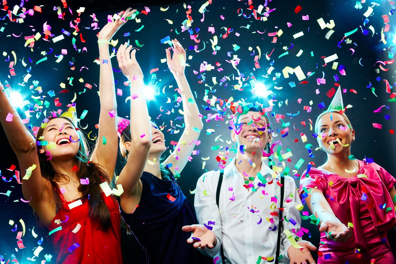 beautiful women partying girls at party new year party woman girls party dancing long hair model Success, party , celebration concept .Young girl dancing and having fun in the rain of confetti on a . .
