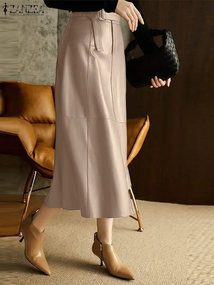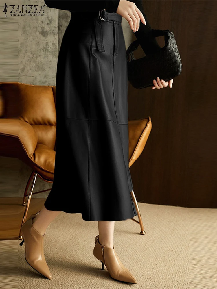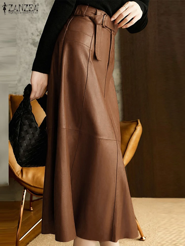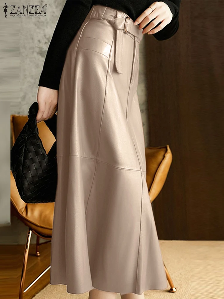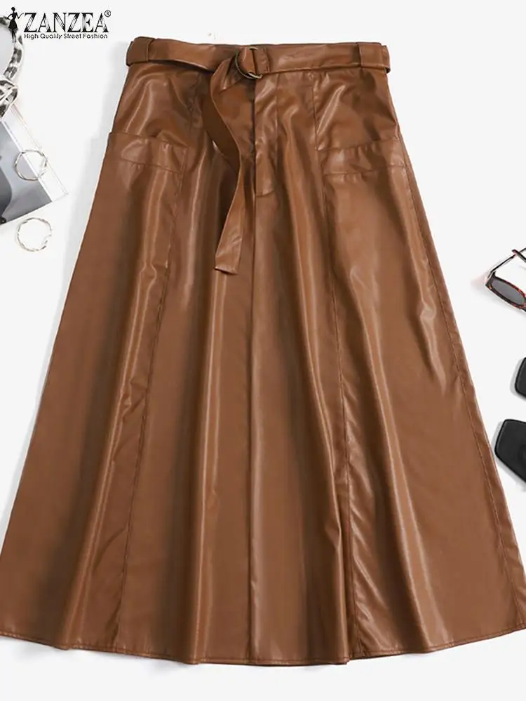 "ZANZEA Office Lady A Line Midi Skirts Fashion PU Leather Long Skirt Women High Waist Jupes 2022 Autumn Belted Stitching Faldas" * Buy Now Just For 19$