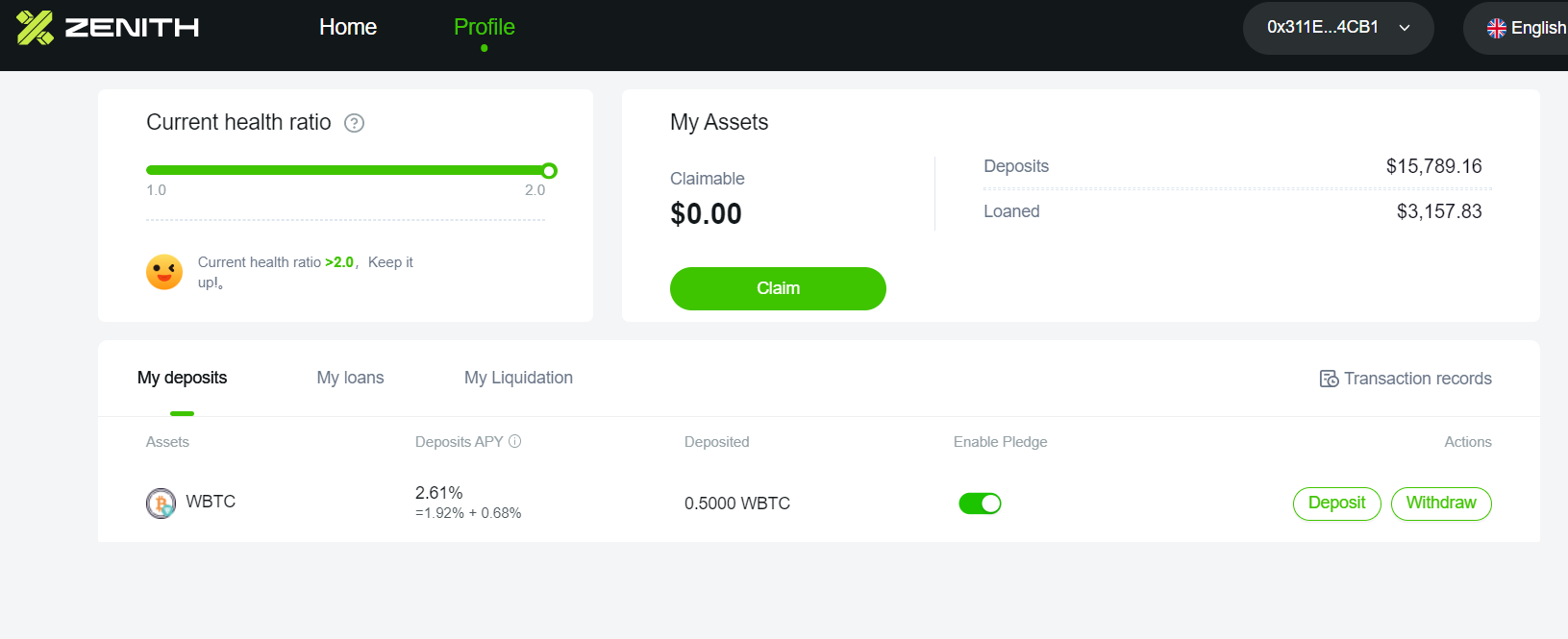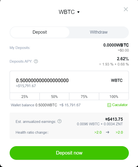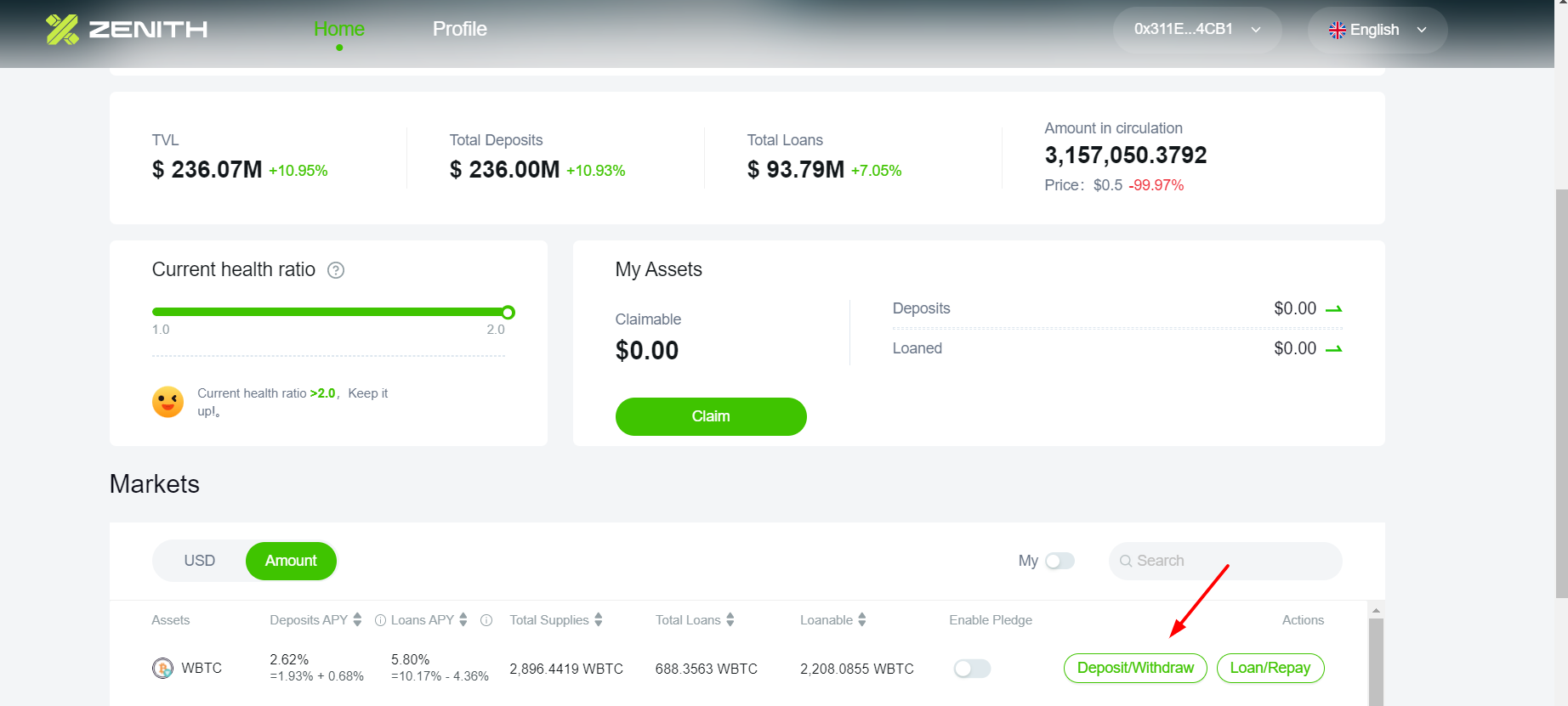 Переходим на сайт https://www.zenith.finance/ нажимаем на Deposit\Withdraw