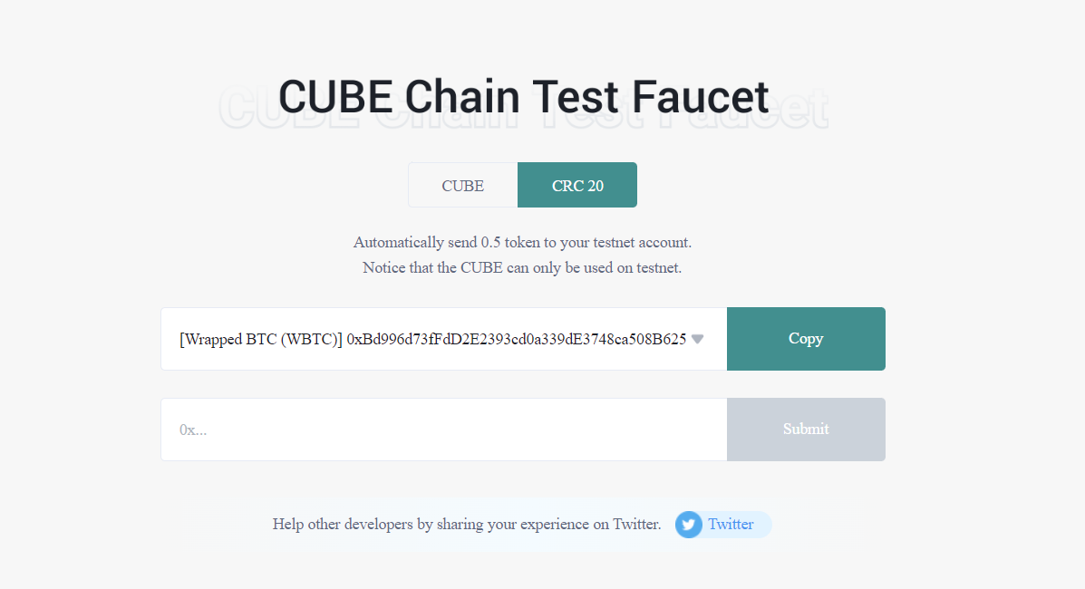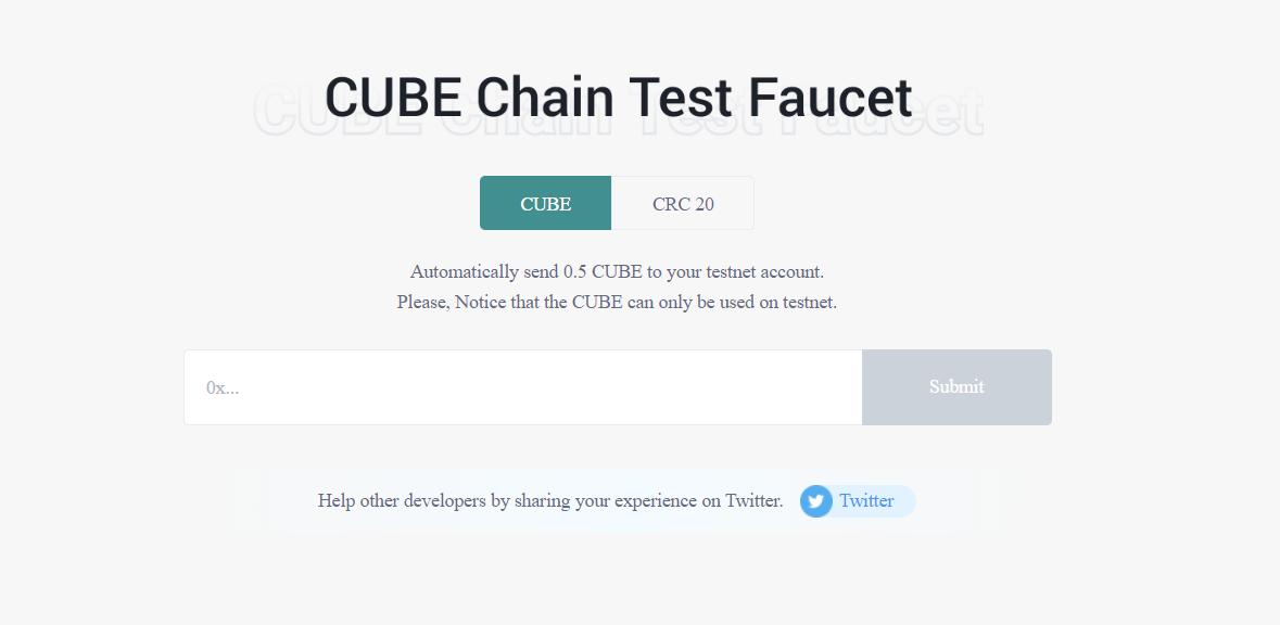 Получаем тестовые токены в кране https://faucet.cube.network/