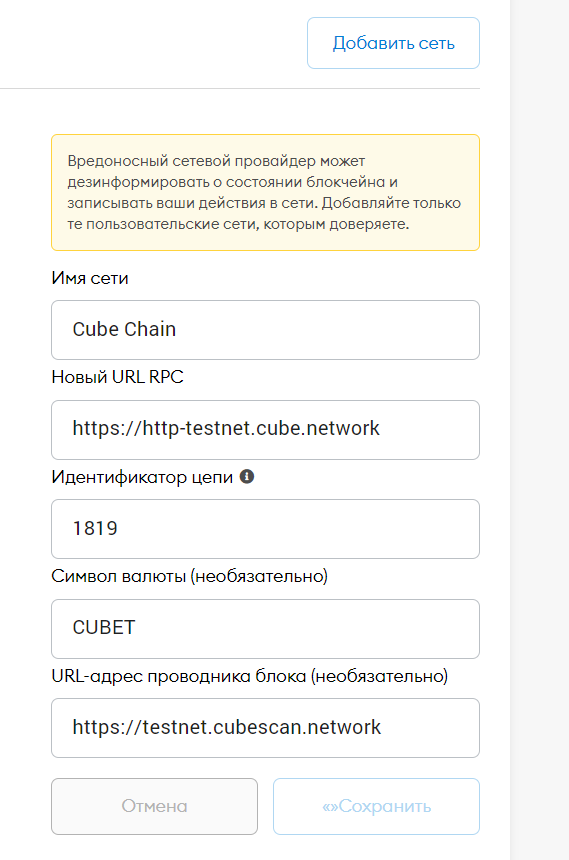 Добавляем сеть Cube Chain в метамаск