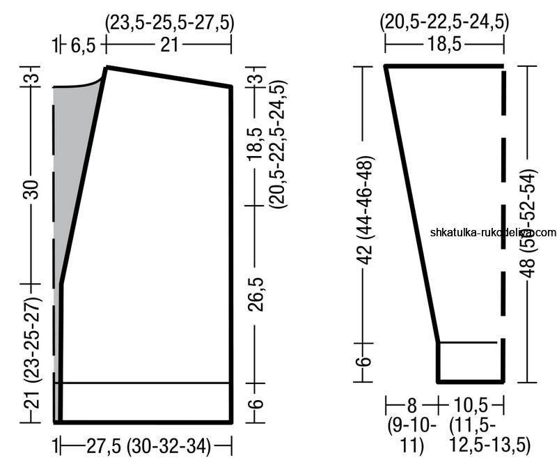 Для скосов прибавить с обеих сторон в 7-м р. от планки 1 раз по 1 п., затем 7 (8-7-6) раз в каждом 6-м р. и 0 (0-2-4) раза в каждом 4-м р. по 1 п. = 38 (42-46-50) п. Через 42 (44-46-48) см = 54 (56-60-62) р. от планки закрыть все петли.