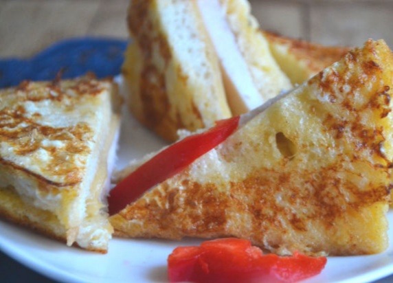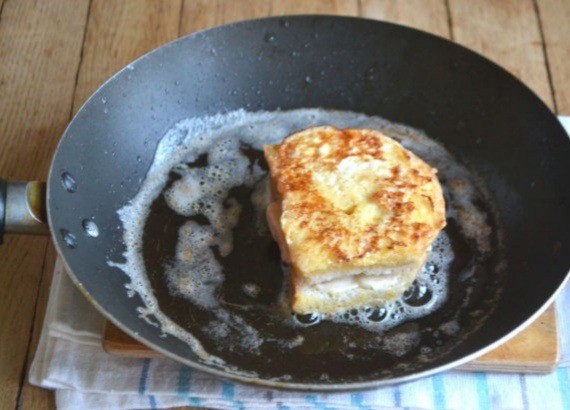 9. На сковороде разогреваем сливочное масло и обжариваем бутерброды в льезоне до образования нежно-золотистой корочки с двух сторон.