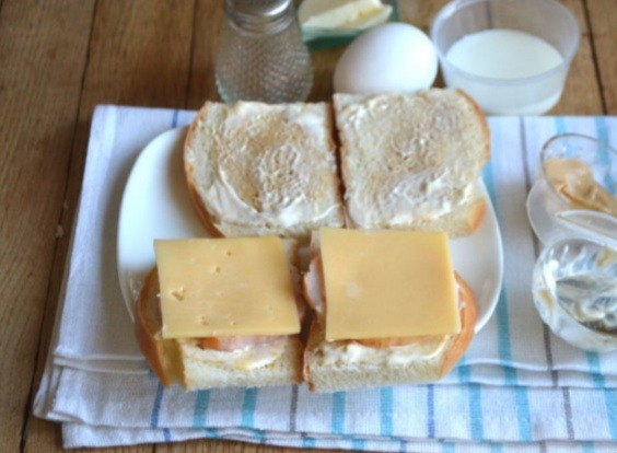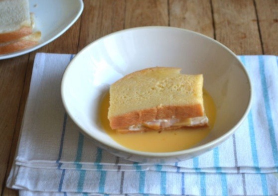 8. Кладем бутерброды с ветчиной и сыром на 1 минуту в яично-молочную смесь (льезон).