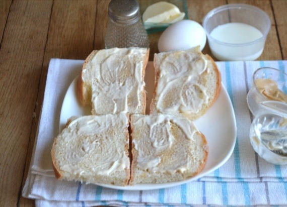 2. Ломтики белого хлеба смазываем тонким слоем горчицы.
