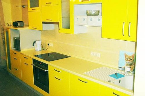 Желтая кухня в интерьере легко станет изюминкой оформления . Фасады шкафов можно выполнить матовыми, но шикарнее в ярком цвете смотрится глянец . Дизайн предмета надо хорошо продумать .