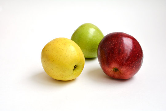 Желтое, зеленой и красное яблоко . Мокрые зеленые плоды . Зеленый листок . Вкусные фрукты на бе5лом фоне . Сладкая картинка спелого яблока . Красный и зеленый фрукт . Список витаминов в составе .