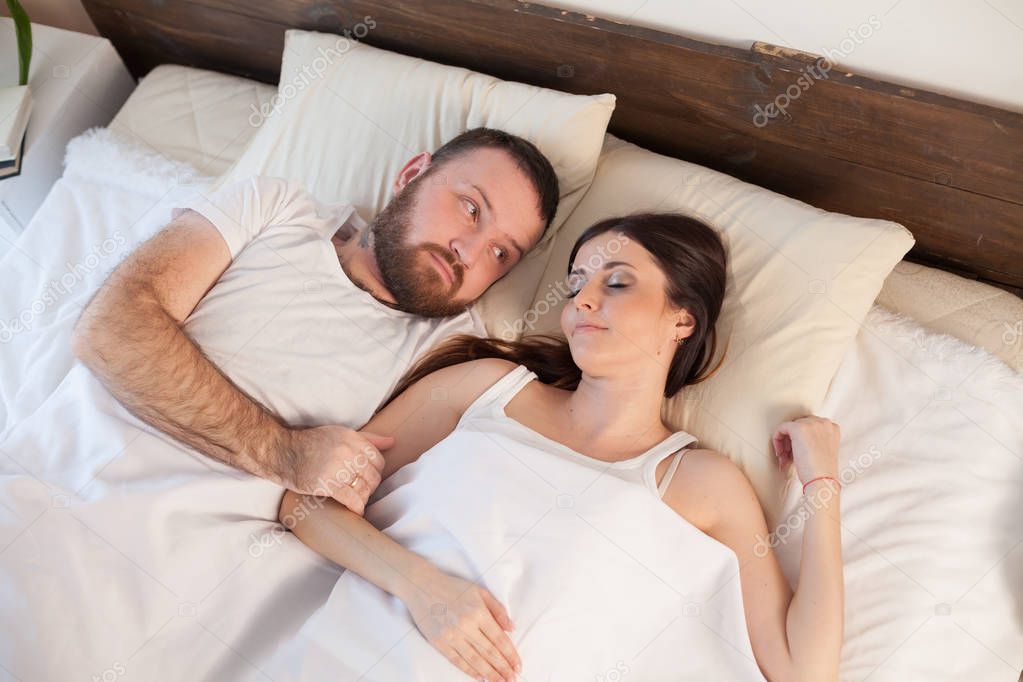Депрессивная пара муж и жена сидят головой в руках на кровати в темной спальне с низкой освещенности, драматическая концепция