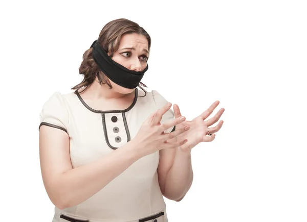 Террор в результате уязвимости . Женщина привязана к стулу . Бизнесмены, связанные бюрократической волокитой . Связанная женщина с кляпом . Человек с клейкой лентой во рту . Женщина с завязанным ртом . Беззвучная маска . Оголтелая бизнесвумен изолирована на белом . Человек с . . .