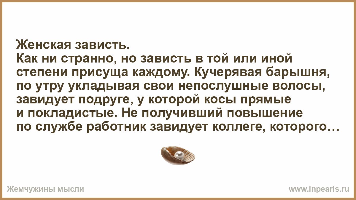 Нередко это сопровождается желанием, чтобы тот человек лишился возможности, обстоятельств или вещи, которую он получил . Женская зависть, как и мужская, тесно связана с психологией, которую важно понять . Она зарождается еще в детстве, когда у подруги появилось красивое . . .